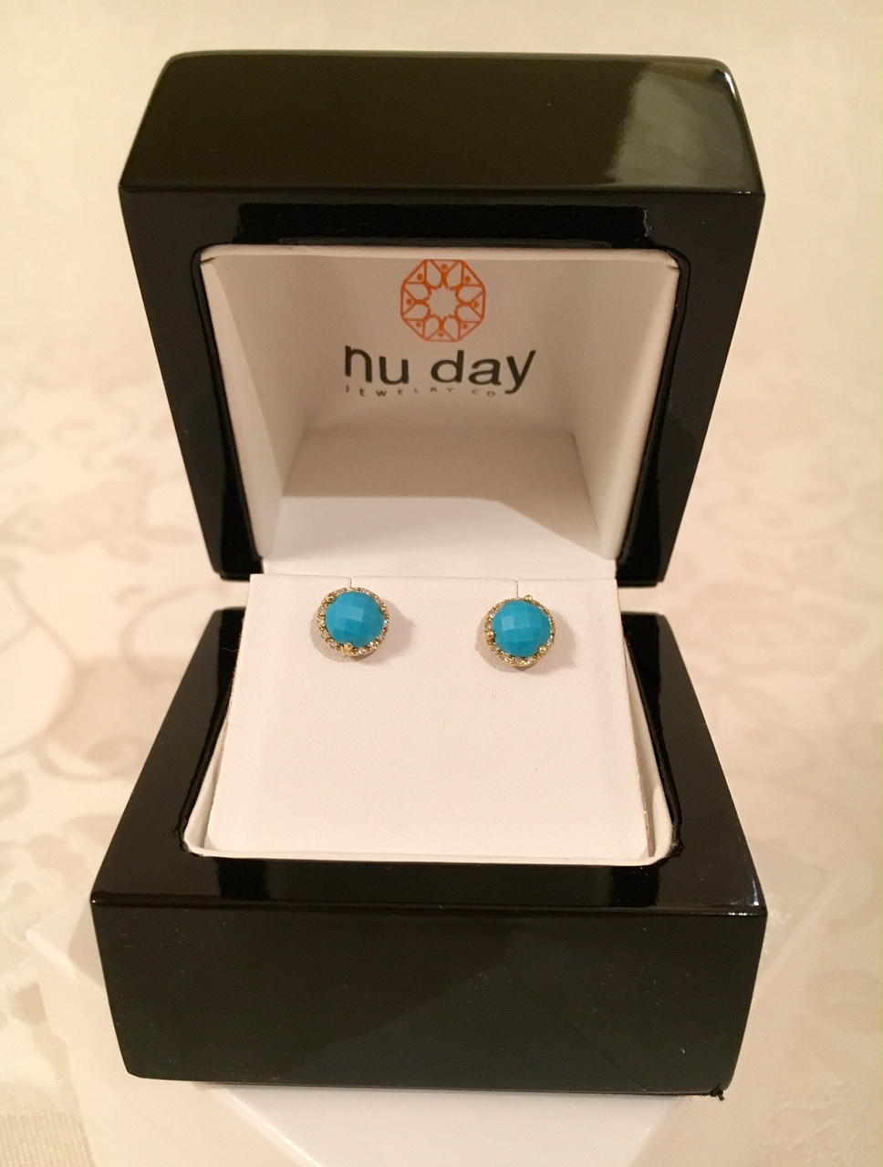 14 kt yellow gold stud earrings with turquoise and diamond chips.
