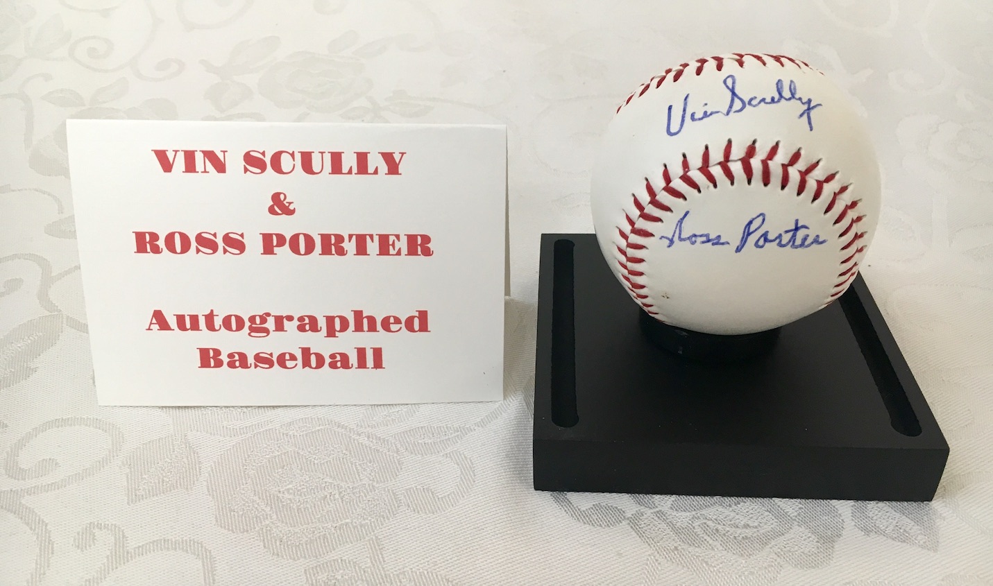 Baseball autographed by Hall of Fame announcer Vin Scully and sports announce Ross Porter.