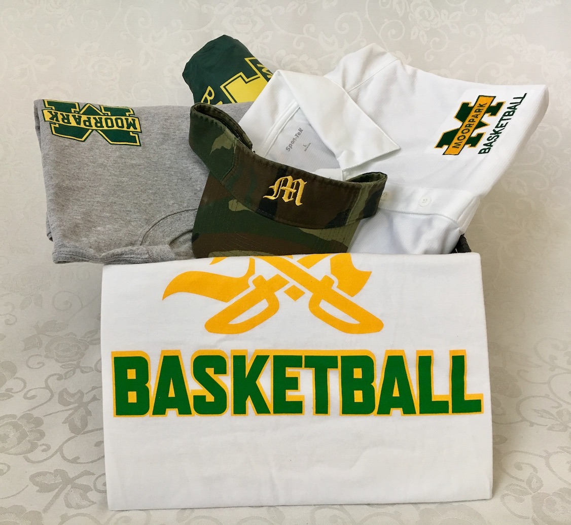 Moorpark High School items include: visor, hat, basketball tote, basketball T-shirts (size Small and 2X) and baseball collared shirt (size Large).