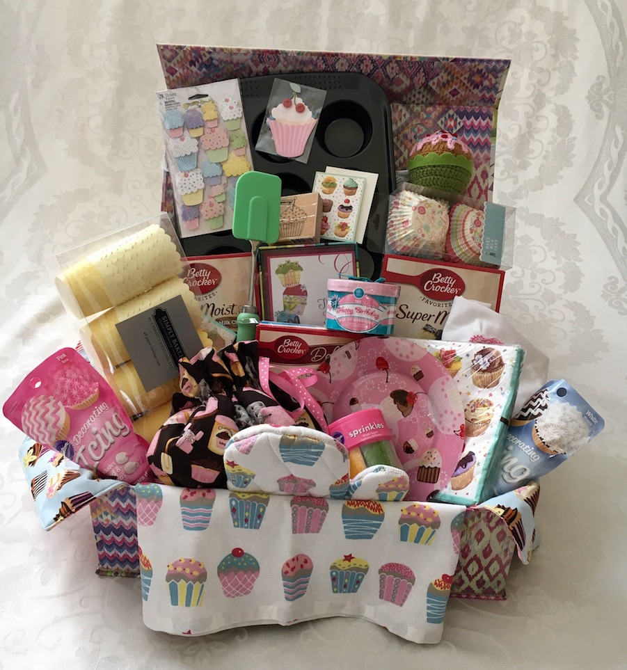 Cupcake items include: table runner, tea towel, oven mitt, decorative plate, napkins, note cards, stickers, 3 cake mixes, muffin pan, sprinkles, icing, baking papers and spatula.